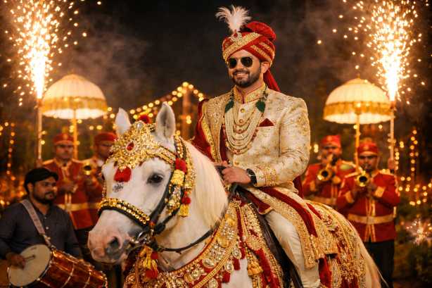 A traditional and majestic entry that enhances the groom’s presence and cultural value.